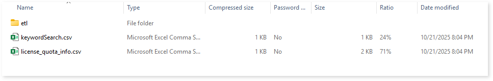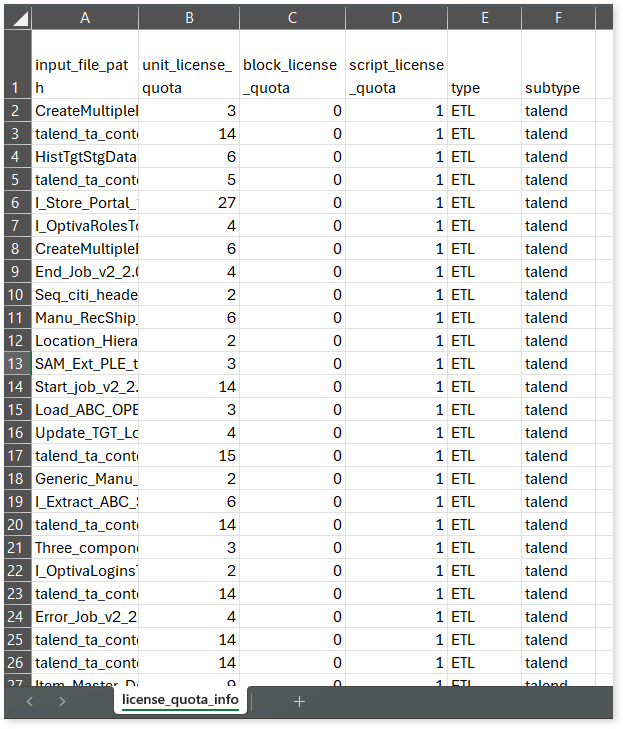 license_quota_info.csv: This report provides information about the anticipated license quota deduction when executing a transformation pipeline or notebook using the same source input file that was used during the assessment. It includes details about the expected quota consumption for units, blocks, and scripts.