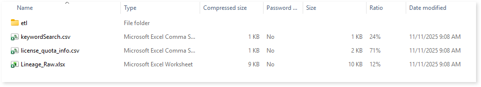 Lineage_Raw.xlsx: This report provides complete dependency details for all nodes. It provides an end-to-end data and process lineage that helps to identify the complete dependency structure and the data flow.