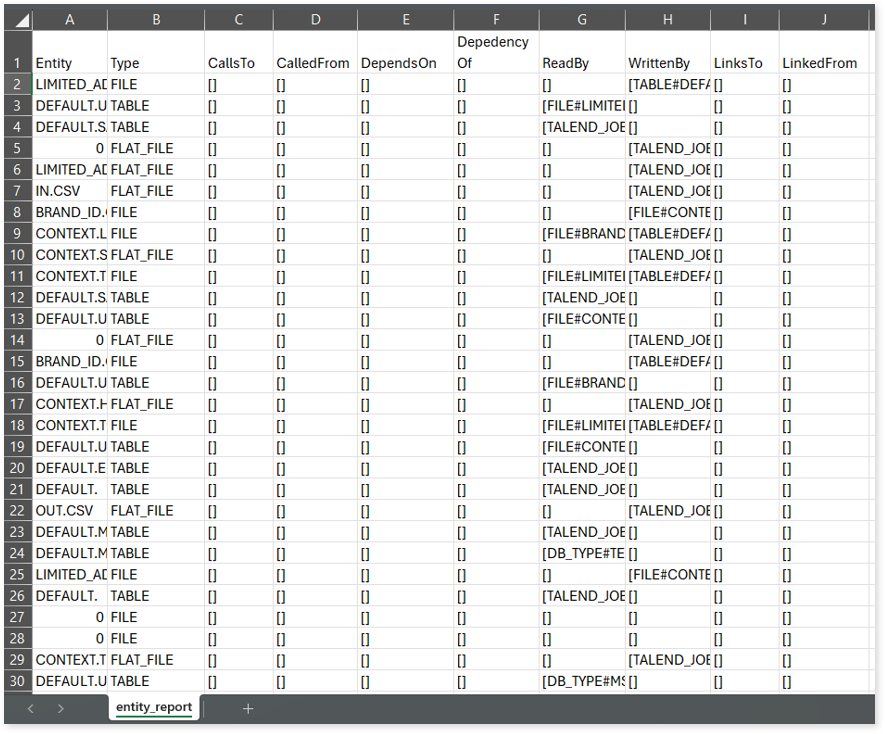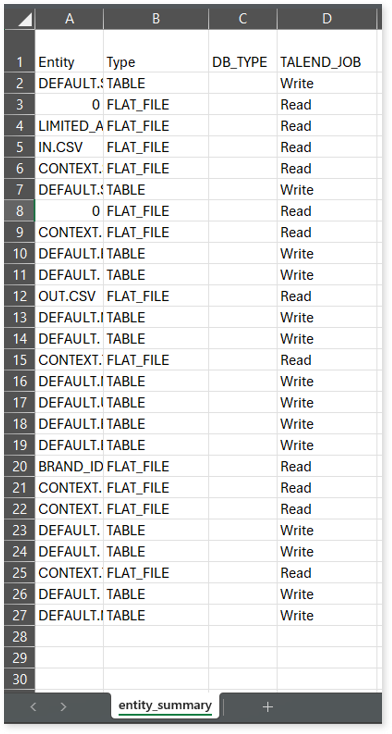 entity_summary.csv: This report provides information about each entity along with the type of relation in which it appears—such as database type, Talend job—and the operation performed in that context, including Read, Write, or ReadWrite.