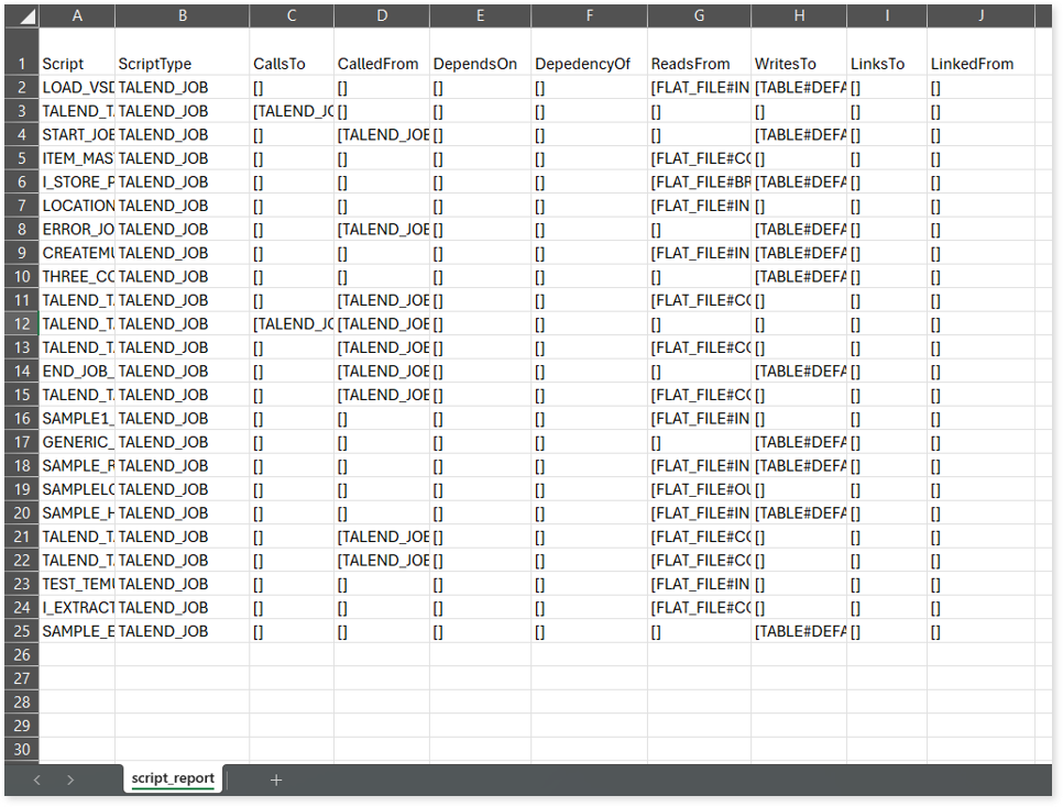 script_report.csv: This report provides detailed lineage information for each script. It lists all scripts along with their types, reads data from or writes data to a process or script, and includes other dependency details.